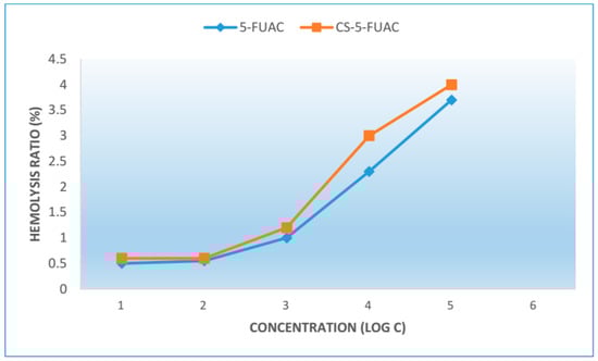 The hemolytic study was carried out as the reported method for red blood cells (RBCs) suspension [25]. Blood from white rabbits was obtained and subjected to a centrifuge at 4000 rpm for 15 min, followed by the addition of a solution of normal saline (0.9% NaCl solution) to acquire the suspension (RBCs 2%). RBCs 2.0 mL dispersed in 8.0 mL normal saline solution as a negative control (making no hemolysis) and distilled water 8.0 mL was added to RBCs 2.0 mL as a positive control (making 100% hemolysis). A solution of FUAC and CS-FUAC concentration of 5, 1.8, 0.57, 0.2, 0.60 and 0.022 mmol/L, respectively, RBCs suspension, 2 mL and normal saline, 1 mL were incubated at 37 °C for 2 h, followed by centrifuge the result solution at 4000 rpm for 15 min. The supernatant was separated and the absorbance was calculated at 541 nm, the typical absorbance of hemoglobin (Hb) released from RBCs. Normal saline was used as a blank. The percentage of hemolysis was calculated by using the following equation: