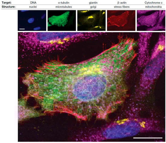 Illustration of the application of complementary fluorophores for the selective detection of different targets in HeLa cancer cells: DNA of nuclei (blue color), α-tubulin of microtubules (green color), giantin of Golgi bodies (yellow color), β-actin of stress fibers (red color), and Cytochrome c of mitochondria (purple color). Scale bars: 20 μm (reprinted from [] with permission, Copyright American Association for the Advancement of Science, 2006).