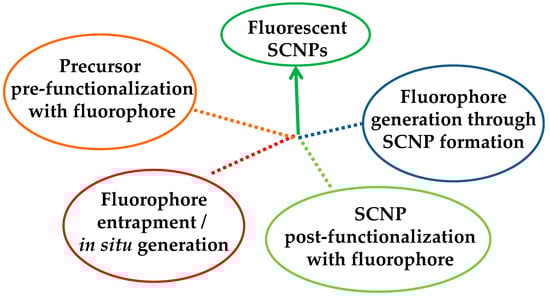 Four different ways have been opened to endow SCNPs with fluorescence properties (Figure 2): (i) “precursor pre-functionalization with fluorophore,” i.e., functionalization of the SCNP precursor polymer with fluorophore molecules before intramolecular cross-linking, (ii) “fluorophore entrapment/in situ generation,” i.e., entrapment of external fluorophore molecules into non-fluorescent SCNPs by taking advantage of the denser local packaging zone(s) of the SCNPs or in situ generation of the fluorophore molecule inside the SCNP, (iii) “SCNP post-functionalization with fluorophore,” i.e., post-functionalization of the SCNPs via chemical reaction with appropriate, complementary reactive fluorophore molecules, and (iv) “fluorophore generation through SCNP formation,” i.e., generation of fluorophore functional groups through intramolecular cross-linking.