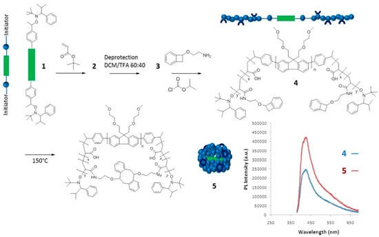 Another example of the “precursor pre-functionalization with fluorophore” method is provided in Figure 4. In this work by Adkins et al. [], the SCNP precursor polymer 4 was an ABA-type triblock copolymer in which the center block (B) was an ethylene oxide modified polyfluorene segment, and the lateral blocks (A) were polyacrylate segments decorated with low-temperature benzocyclobutene cross-linking groups. Interestingly, the A blocks were synthesized through nitroxide-mediated living radical polymerization by using the fluorescent B block as a telechelic macroinitiator. Characterization of 4 by UV-vis and fluorescence spectroscopy revealed absorption and emission peaks at 370 and 438 nm, respectively, with a quantum efficiency of 2.8%. Upon the folding/collapse of 4 via benzocyclobutene dimerization at high dilution, the resulting SCNPs 5 were found to display UV-vis absorption and fluorescence emission peaks also centered at 370 and 438 nm but with an increased quantum efficiency of 5.1%. This was attributed to the site-isolation effect (i.e., encapsulation) experienced by the fluorescent B block upon intramolecular cross-linking of the A blocks. A similar effect was previously found by Adkins et al. [] for ABA triblock copolymers containing fluorene and fluorene/thiophene center blocks that were soluble only in organic solvents (dichloromethane and cyclohexane). Remarkably, the length of the A block was found to have a significant effect in promoting this site-isolation effect.