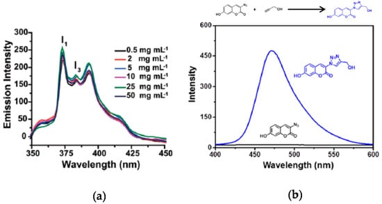 Emission spectra of pyrene sequestered into non-fluorescent SCNPs as a function of the concentration of SCNPs (a), and synthesis of a fluorescent compound into non-fluorescent Cu(I)-containing SCNPs via Cu(I)-catalyzed azide-alkyne cycloaddition of 3-azido-7-hydroxycoumarin and propargyl alcohol (b) (reprinted with permission from [], Copyright Royal Society of Chemistry, 2015 and [], Copyright American Chemical Society, 2015, respectively).