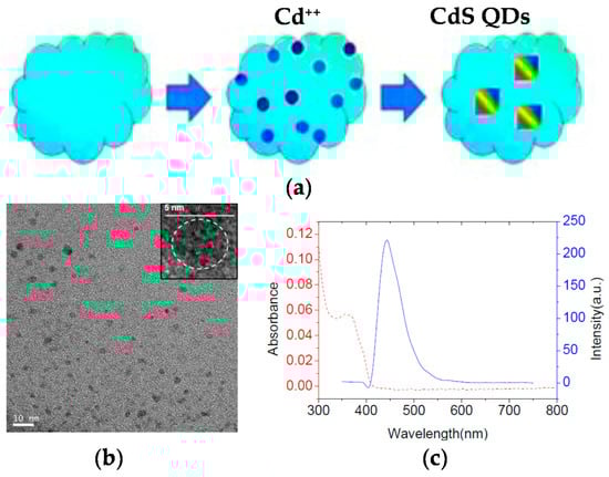 The application of non-fluorescent SCNPs as efficient nanoreactors for the synthesis of fluorescent QDs in situ was pioneered by Qian et al. [] (Figure 6a). Hydrophilic SCNPs synthesized through Bergman cyclization-mediated intramolecular folding/collapse followed by hydrogenolysis on Pd/C were utilized as size-tunable nanoreactors to fabricate and encapsulate QDs in a one-pot reaction. SCNPs were prepared from linear precursors of different size (number-average molecular weight (Mn): 30.3, 62.5 and 115.2 kDa) and functionalization (10 and 25 mol % of reactive enediyne groups). SEC measurements confirmed the successful formation of SCNPs, whereas the 3D morphology of the hydrophilic SCNPs on a mica surface was visualized by AFM. As a proof of concept, photoluminescent zinc sulfide (ZnS) QDs were fabricated and encapsulated in SCNPs of different size. Smaller nanoreactors produce a single QD each (4.1 nm in size) giving to higher emission intensity (quantum yield, QY = 17% at λ = 310 nm), while larger nanoreactors form multiple QDs each, resulting in fluorescence quenching (QY = 2%). To further investigate the generality of the method, cadmium sulfide (CdS) QDs (4.7 nm in size, Figure 6b) were synthesized and encapsulated in the smaller nanoreactors showing bright fluorescence centered at 450 nm (Figure 6c) and excellent values of quantum yield (QY = 45%). Moreover, the use of SCNPs as sacrificial nanoreactors for the synthesis of bright photoluminescent carbon nanodots was further reported by the same group [].