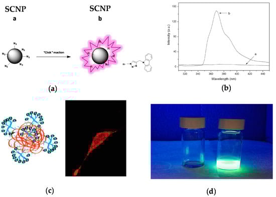 Recently, a variety of reactive fluorophore molecules (dansylhydrazine [], fluorescein [], naphthalene []) have been successfully conjugated to different (polystyrene [], polydimethylamino ethyl methacrylate [], polymethyl methacrylate []) nanoparticles by post-functionalization (Figure 7c). This illustrates the versatility of the SCNP post-functionalization technique to endow SCNPs with florescent properties.