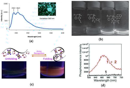 More recently, phosphorescent SCNPs synthesized by means of simple anion recognition have been reported by Ji et al. []. In this work, anion recognition was utilized to control the folding and unfolding of a polymethyl methacrylate-based precursors bearing pendant calix[4]pyrrole and Pt(II)-porphyrin moieties. calix[4]pyrrole was selected as a recognized anion receptor and Pt(II)-porphyrin as a signaling agent due to their bright phosphorescence, long-lived excited-state lifetime and high stability. SCNP formation was carried out in diluted solution using a terephthalate dianion as bifunctional cross-linker, giving to nanoparticles with a diameter as small as 2 nm and a maximum phosphorescence intensity at 670 nm (Figure 8c,d). It is worth of mention that the precursor polymer was not phosphorescent, so the bright phosphorescence of the SCNPs in the latter case was attributed to reduced contact between the Pt(II)-porphyrin moieties and molecular oxygen. Remarkably, the addition of competitive monovalent anions such as F−, Cl−, H2PO4−, HSO4−, Br−, and NO3− gave to a decrease in the phosphorescence intensity due to SCNP unfolding. Phosphorescent SCNPs are hence promising functional nanomaterials for anion recognition.