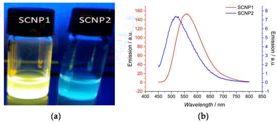 Fluorescent SCNPs produced via nitrile imine-carboxylic acid ligation (SCNP1) as well as nitrile imine-mediated tetrazole-ene cycloaddition (SCNP2) (a), and photophysical characterization of SCNP1 and SCNP2 (b) (reprinted with permission from [], Copyright American Chemical Society, 2017).