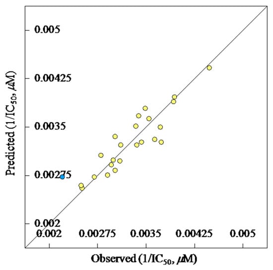 BMLR-QSAR model plot of correlations, the yellow dots are representing the observed vs. predicted vasodilatory active agents for all compounds, while the blue dot is represent an outlier compound (compound 4j).