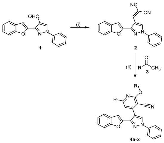 3.1.2. Synthesis of 2-Alkoxy-4-(3-(benzofuran-2-yl)-1-phenyl-1H-pyrazol-4-yl)-6-phenylpyridine-3-carbonitriles (4a–x)