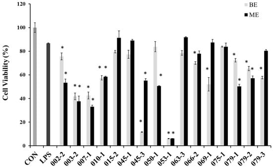 Cell viability of the extracts from marine-derived fungi in RAW 264.7 macrophages. Experiments were performed in triplicate and the data are expressed as mean ± SE. BE and ME represent the broth and mycelium extract obtained from each of the cultured fungus. * p < 0.05 indicates significant differences from the LPS-stimulated group.