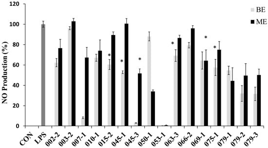 In order to evaluate cytotoxicity of the extracts from marine-derived fungi in RAW 264.7 cells, cell viabilities were estimated via an MTT assay, which is a test of metabolic competence predicated upon the assessment of mitochondrial performance. As shown in Figure 1, the cells treated with LPS showed 87% cell viability, and some extracts showed strong cytotoxicity in RAW 264.7 cell. Especially, BE and ME of the unidentified strains of 003-2 and 007-1, as well as P. chrysogenum (010-1), P. janthinellum (053-1), Penicillium sp. (079-1), P. chrysogenum (079-2), Penicillium sp. (079-3) and the BE of A. clavatus (045-3), F. oxysporum (069-), the ME of Fusarium sp. (050-1), P. crustosum (066-2) showed lower cell viabilities than those of other extracts. However, the BE of E. amstelodami (015-2), E. amstelodami (045-1) and ME of P. oxalicum (075-1) showed slight cytotoxicities in RAW 264.7 cells. From the result it is very clearly proved that E. amstelodami is relatively non-toxic and can release non-toxic substances.
