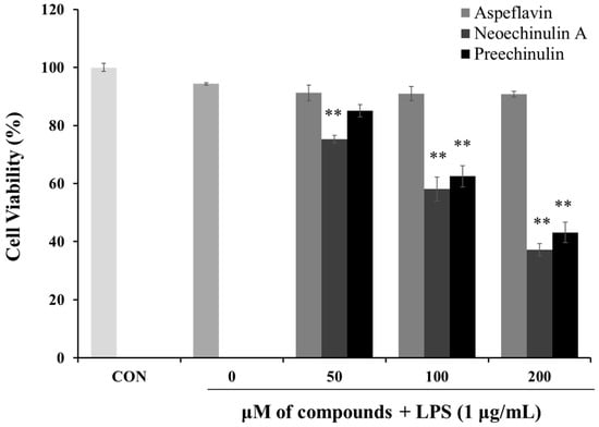 Cytotoxicities of asperflavin, neoechinulin A and preechinulin on cell viability in LPS-stimulated RAW 264.7 cells. RAW 264.7 cells were cultured with the different concentrations (50, 100, and 200 μM) of the compounds and LPS (1 μg/mL) for 24 h. Each value indicates the mean ± S.D. and is representative of results obtained from three independent experiment. ** p < 0.01 indicates significant differences from the LPS-stimulated group.