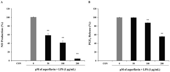 Inhibitory effect of asperflavin on NO (A) and PGE2 (B) production in LPS-stimulated RAW 264.7 cells. Cells (1 × 105 cells/mL) were stimulated by LPS (1 μg/mL) for 24 h in the presence of asperflavin (50, 100, and 200 μM). The NO production was assayed in the culture medium and the PGE2 production in the supernatants was determined by ELISA. Each value indicates the mean ± S.D. and is representative of results obtained from three independent experiment. ** p < 0.01 indicates significant differences from the LPS-stimulated group.