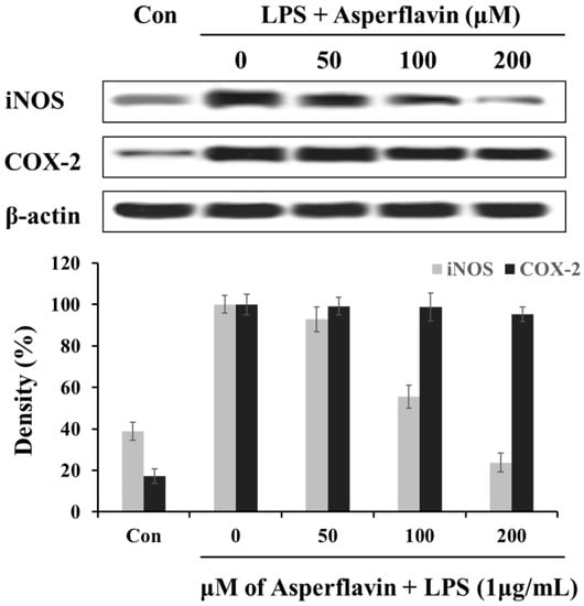 Inhibitory effects of asperflavin on the expression of iNOS and COX-2 in LPS-stimulated RAW 264.7 cells. The RAW 264.7 cells were pre-incubated for 18 h, and stimulated with LPS (1 μg/mL) for 24 h in the presence of asperflavin (50, 100, and 200 μM). The expression levels of iNOS and COX-2 were determined using immunoblotting method.
