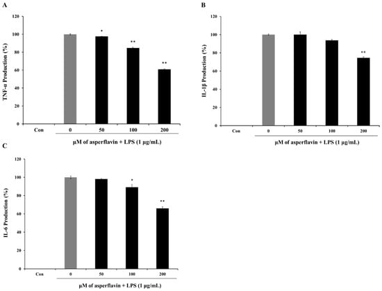Inhibitory effects of asperflavin on TNF-α (A); IL-1β (B) and IL-6 (C) production in LPS-stimulated RAW 264.7 cells. The production of TNF-α was assayed in the culture medium of cells stimulated by LPS (1 μg/mL) for 24 h in the presence of asperflavin (50, 100, and 200 μM). Supernatants were collected, and the TNF-α, IL-1β and IL-6 production in the supernatants were determined by ELISA. Each value indicates the mean ± S.D. and is representative of results obtained from three independent experiment. * p < 0.05 and ** p < 0.01 indicate significant differences from the LPS-stimulated group.