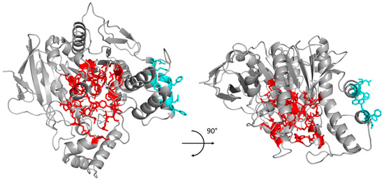 Structural representation of the selected conserved residues of human butyrylcholinesterase (hBChE) for the PROSS process. Residues conserved in order to preserve enzymatic activity are represented in red, those conserved to maintain dimer interaction are represented in cyan.