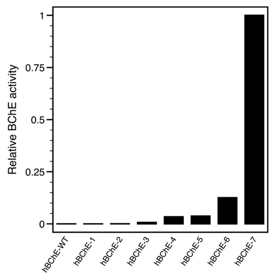 Comparison of BChE activity in the bacterial soluble extracts of the different BChE constructs. An aliquot on each soluble extract from pThioHis constructs of hBChE-wild-type (WT) and hBChE-1 to hBChE-7 was measured for butyrylthiocholine hydrolase activity. Activities were normalized to the highest measured sample.