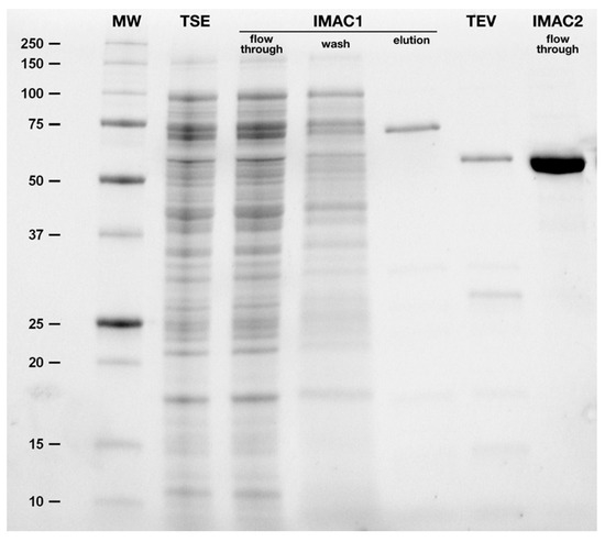 Analysis of the purification of hBCHE-7. A polyacrylamide gel electrophoresis was realized in denaturing conditions with an aliquot of different purification steps. Molecular weight (MW, and corresponding digits in kDa); total soluble extracts (TSE); flow-through, wash and elution fractions of the first metal ion affinity chromatography (IMAC1); dialysis and TEV-protease cleavage (TEV); and, flow-through fraction of the second IMAC (IMAC2).
