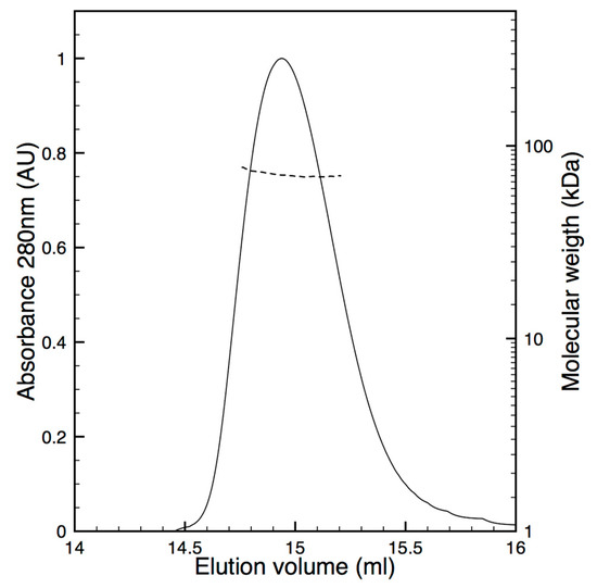 Physiologically BChE is mainly a tetramer through the interaction of the C-terminal helices of each monomer that is associated in a coiled coil motif around an antiparallel proline rich peptide originating from lamellipodin [26,27,28]. Some recombinant BChE productions and X-ray structures have reported the isolation of dimers of BChE and the tetrameric form can be view as a dimer of dimers. During the PROSS process we maintained the residues involved in this dimer interface, namely two helices, in the prospect to isolate a dimeric form of the recombinant enzyme. To address the oligomeric state of the isolated hBChE-7, a size-exclusion chromatography and multi-angles light scattering (SEC-MALS) analysis was carried out (Figure 4).