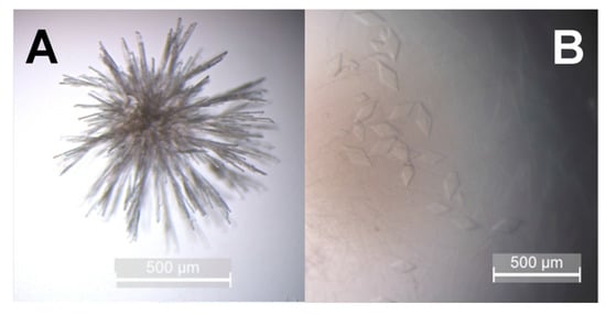 Crystals of hBChE-7. Crystallization was realized by the hanging drop method using 0.2 M NH4OAc pH 7.4 and 20% polyethylene glycol (PEG) 3350 as precipitation solution. hBhE-7 at a concentration of 2 mg mL−1 was mixed 2:1 with the precipitation solution. (A) crystals grown at 20 °C; (B) crystals grown at 4 °C.