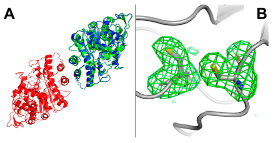 Structure of hBChE-7. (A) cartoon representation of the in cristallo dimer form of hBChE-7 (PDB ID 6EMI) as red and blue chains. Superposition of the structure of recombinant hBChE from CHO cells (PDB ID 1P0I), green chain; (B) representation of the broken Cys65-Cys92 disulfide bond in chain B. Protein backbone is represented in gray. Residues Cys65 and Cys92 are represented as sticks with carbon atoms in gray, oxygen atoms in red, nitrogen atoms in blue and sulfide atoms in yellow. An |Fo − Fc| electron density map calculated by omitting residues Cys65 and Cys92 from the model is represented as a green mesh with a 3.0 σ contour.