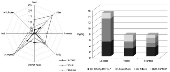 The contribution of volatiles to aroma of the monovarietal oils is different: Luna and co-workers [68] found that thirteen volatiles did not contribute at all because their odour activity values were lower than 1.0, thirteen of them contributed only for a certain number of varieties and only seven concurred to the sensory profile of all cultivars.