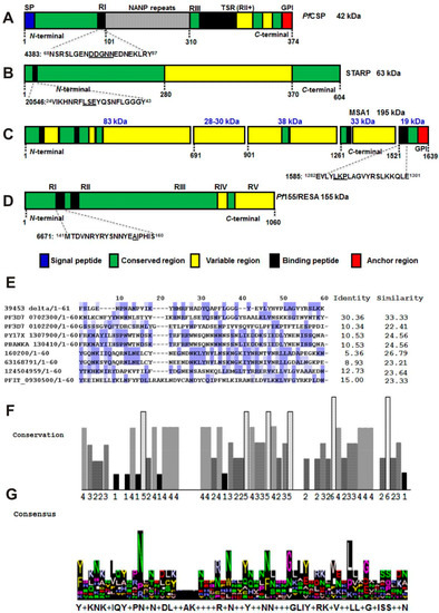 Genetic organization of P. falciparum antigen-peptide targets and bioinformatics. (A) PfCSP sporozoite protein and its 4383 peptide; (B) STARP sporozoite antigen and its native 20546 peptide; (C) MSA1 merozoite protein and its 1585 native peptide; (D) PfRESA merozoite antigen and its 6671 native peptide; (E) Alignment of the large-chimera edited sequence displaying only the Plasmodium-derived sequences (39453_delta chimera). Color code for sequence identify: 80% mild blue; higher than 60% in light blue; higher than 40% in light gray and lower than 40% in white; (F) Sequence conservation by Jalview-EBI where the 11* score represents identical, 8 and 7 conserved, and 6 and 5 semi-conserved amino-acids respectively; (G) A logo-fashion for a consensus sequence is shown in different colors for amino-acids.