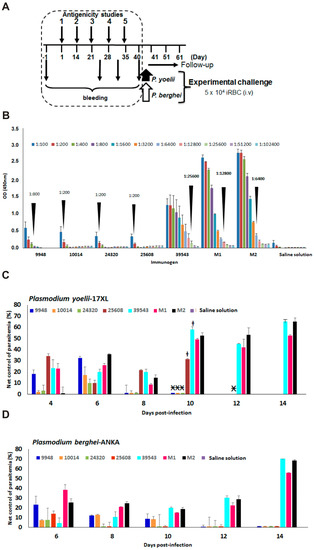 After antigenicity studies have proven developing high antibody titers in vaccinated animals, each test group of animals was splitted and got prepared for a Plasmodium infection by experimental challenging with P. berghei and P. yoelii strains respectively. As previously published, for experimental challenging, both in vivo obtained strains, showing a 40–50% range of parasitaemia, were independently centrifugated at 1500 rpm for 5 min; the pellet containing about 1 × 107 infected red blood cells (iRBCs) was suspended in 1 mL RPMI and immediately used for either intravenously or intraperitoneal inoculated, each animal was administered with 5 × 104 iRBCs. Parasitemia in all infected animals was monitored by Wright and acridine-orange staining of blood-smear, showing that mice became parasitized by the second to sixth day after infection, and that parasitemia levels increased faster until animals died 12 to 15 days after having been infected. Parasitaemia follow-up was performed accordingly to the experiment requirements. Animal care was in accordance with international guidelines. Animals subjected to invasive procedures were treated under anesthetic, analgesic and tranquilizing and intra muscularly administrated with a combination of 150 mg/kg ketamine/10 mg/kg, xylazine [27,28].
