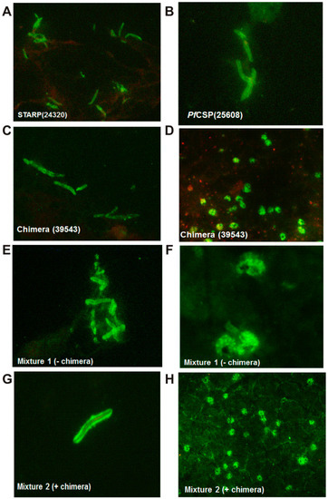 Vaccinated mice antibody reactivity to P. falciparum native antigens by IFA. P. falciparum sporozoite forms detected by antibodies induced by (A) 24320-STARP; (B) 25608-PfCSP and (C) the large chimera; (D) P. falciparum mature schizonts revealed by antibodies to the large chimera; (E) Sporozoites detected by antibodies to the M1 mixture; (F) Mature schizonts revealed by antibodies to the M1 mixture; (G) Sporozoites recognized by antibodies to the M2 mixture and (H) Mature schizonts recognized by antibodies to the M2 mixture.