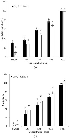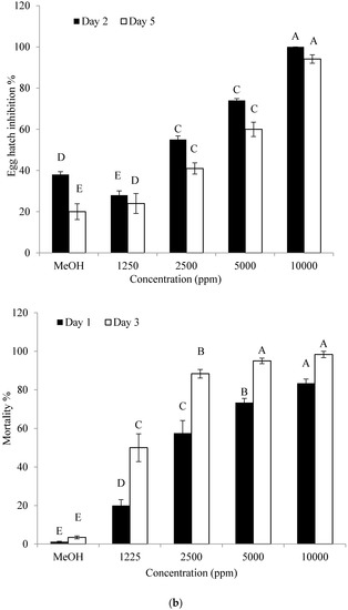 The n-butanol crude extract was found to have a significant effect on the hatching of eggs and J2 mortality. With the increase in crude extract concentrations and incubation time, a significant increase in hatch inhibition and J2 mortality was recorded. The crude extract significantly inhibited the hatching of eggs on the fifth day of incubation (Figure 2a,b). The inhibitory effect on the hatching of eggs was also observed even on the second day of incubation when higher doses (2500 and 5000 ppm) were used. When a high concentration of the crude extract was used against J2, mortality increased at both one and three days after incubation. More than 98% of J2 were dead as early as one day after incubation using 5000 ppm of crude extract.