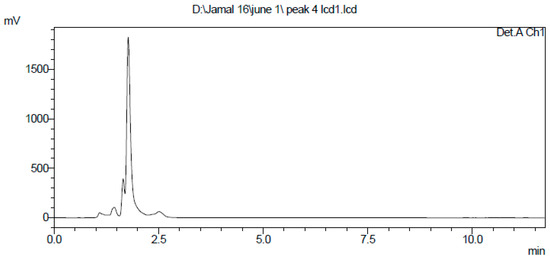 The n-butanol crude extract of the BCS displayed nematocidal activity against M. incognita. Silica gel column chromatography yielded a bioactive fraction with significant nematocidal activity. That fraction was further purified by preparative HPLC and finally, 20 mg of a nematocidal compound was obtained. The purity of the compound was confirmed by a single peak at a retention time of 1.90 min using an analytical HPLC column (Figure 3).