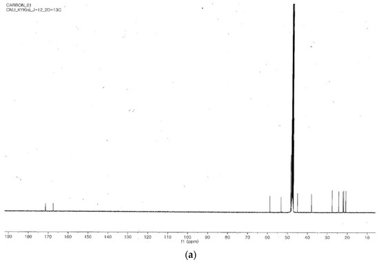Nuclear magnetic resonance (NMR 1H, 13C, H-H COSY, HSQC, and HMBC) was used to determine the purified compound’s structure. The purified nematocidal compound was dissolved in 0.6 mL methanol-d4 (CD3OD) before spectral analysis was conducted. NMR spectra were recorded using a DRX 500 NMR instrument (Bruker, Rheinstetten, Germany) working at 500 MHz for 1H, and 125 MHz 13C at 25 °C. Chemical shifts are stated in ppm (δ) and tetramethylsilane (CH3)4Si was used as an internal standard. 1H-NMR (ppm): 0.95 (3H, d, 6.6 Hz), 0.67 (3H, d, 6.5 Hz), 1.53 (1H, m, 3′b), 1.90 (1H, m, H-3′a), 1.88 (1H, m, H-4′), 4.13 (1H, m, H-2′), 2.01 (1H, m, H-4a), 1.95 (1H, m, H-4b), 3.52 (2H, m, H-5), 4.27 (1H, dt, 9.3 Hz, 1.5 Hz, H-2), 2.30 (1H, m, H-3a), 2.04 (1H, m, H-3b). 13C-NMR (ppm): 22.2 (C-6′), 23.3 (C-5′), 23.6 (C-4), 25.8 (C-4′), 29.1 (C-3), 39.4 (C-3′), 46.4 (C-5), 54.6 (C-2′), 60.3 (C-2), 168.9 (C-1′) and 172.8 (C-1).