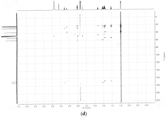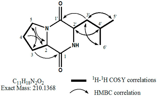 The purified nematocidal compound was identified on the basis of its structure using 1H, 13C, 1H-1H COSY, HSQC and HMBC NMR spectra as shown in Figure 4a–d, respectively. The compound was thus identified as cyclo(d-Pro-L-Leu) and confirmed to be similar to the compound reported by Quyen et al. [29]. The proposed structure of cyclo(d-Pro-L-Leu) is shown in Figure 5.