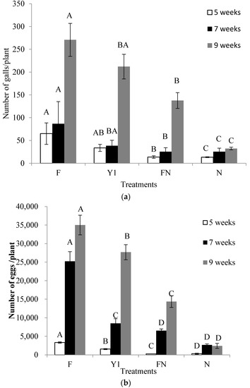Effect of B. amyloliquefaciens Y1 on number of (a) galls and (b) eggs per tomato plants root treated with fertilizer medium (F), bacterial culture (Y1), fertilizer medium + commercial nematicide (FN) and commercial nematicide (N) at 5, 7 and 9 weeks after M. incognita infestation. Fertilizer medium was used as control and Mocap was used once as nematacide. Error bars represent standard error of the mean from four replicates. Means with the same letter in same observation time are not significantly different at p ≤ 0.05 when compared with LSD.