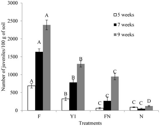 Effect of B. amyloliquefaciens Y1 on number of juveniles in 100 g soils in tomato plants treated with fertilizer medium (F), bacterial culture (Y1), fertilizer medium + commercial nematicide (FN) and commercial nematicide (N) at 5, 7 and 9 weeks after M. incognita infestation. Fertilizer medium was used as control and Mocap was used once as nematacide. Error bars represent standard error of the mean from four replicates. Means with the same letter in same observation time are not significantly different at p ≤ 0.05 when compared with LSD.