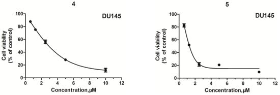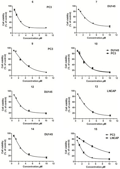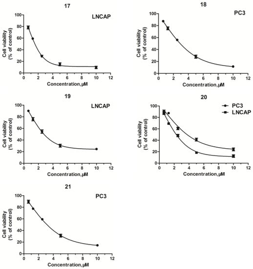 As shown in Table 1, the majority of the compounds exhibited a more effective cytotoxic activity than the arylpiperazine derivatives with the 1,3-benzodioxol moiety [] and the arylpiperazine derivatives with the 3,5-dimethoxyphenoxyl moiety [] against the tested cancer cell lines, and exhibited excellent selective activity for the tested cancer cells (Figure 2). For example, the compounds 6, 9, and 21 exhibited excellent selective activity for PC-3 cells over other cancer cells, and the compounds 13, 17, and 19 exhibited excellent selective activity for LNCaP cells over other cancer cells. Moreover, the compounds 4, 5, 7, 12, and 14 exhibited excellent selective activity for DU145 cells over other cancer cells.
