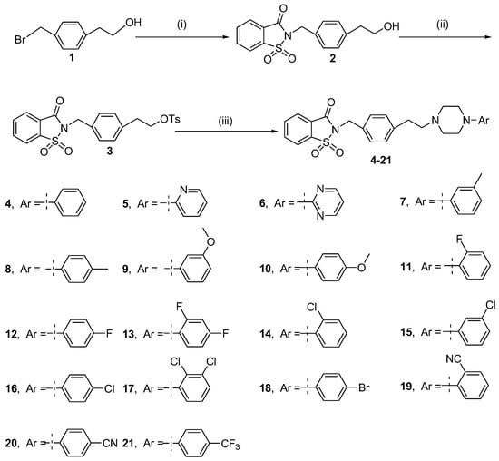 As depicted in Scheme 1, a series of novel arylpiperazine derivatives were synthesized starting from 2-(4-(bromomethyl)phenyl)ethanol 1. First, the nucleophilic substitution reaction of compound 1 with saccharin sodium in the presence of potassium carbonate (K2CO3) gave compound 2 (85% yield) after 16 h at reflux, and then compound 2 was treated with 4-toluene-sulfonyl chloride in the presence of triethylamine and a catalytic amount of 4-dimethylaminopyridine at 0 °C for 16 h to generate compound 3 (85% yield). Finally, the reaction of compound 3 with various arylpiperazines in the presence of K2CO3 was heated at reflux for 16 h to obtain arylpiperazine derivatives 4 to 21 (Scheme 1). The structures of the compounds were confirmed using 1H-NMR, 13C-NMR, MS, and HRMS.