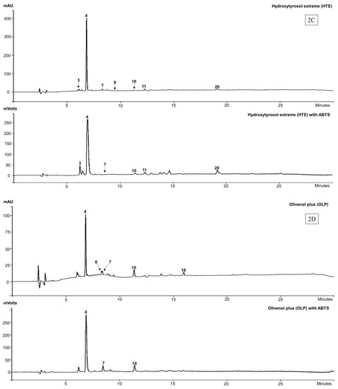 HPLC-DAD-ABTS chromatograms of four commercial extracts of olive at 280 nm and ABTS scavenging at 414 nm. (2A) olive leaf extracts (OLE); (2B) olive fruit extracts (OFE); (2C) Hydroxytyrosol ExtremeTM (HTE) and (2D) Olivenol PlusTM (OLP).