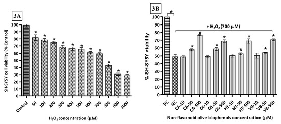 The olive biophenols were prepared at various concentrations and incubated with cells at a density of 5 × 103 cells/well in the sterile clear 96 well plates and maintained at 37 °C under 5% CO2/95% humidified air in an incubator for 24 h [33]. To determine the protective effect of the olive biophenols, freshly prepared H2O2 (at the LD50 concentration) was added to each well containing cells pre-treated with olive biophenols, and incubated for further 24 h at 37 °C under 5% CO2/95% humidified air in an incubator.