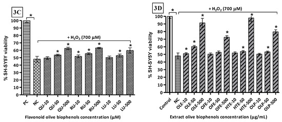 H2O2-induced SH-SY5Y cells toxicity and protection by olive biophenols: SH-SY5Y cells were treated with different concentrations of H2O2 for 24 h (3A). SH-SY5Y cells were incubated with different concentrations of non-flavonoid olive biophenols (3B), flavonoid olive biophenols (3C) and extract olive biophenols (3D) for 24 h followed by 700 μM of H2O2 for 24 h. The results are mean ± SE of each parallel measurements analyzed by one way ANOVA, * p < 0.05 vs. control and negative control. NS: non-significant. PC: positive control (cells with media), NC: negative control (cells and H2O2 without biophenols), CA: caffeic acid, OL: oleuropein, HT: hydoxytyrosol, VB: verbascoside, QU: quercetin, RU: rutin, LU: luteolin, OLE: olive leaf extract, OFE: olive fruit extract, HTE: Hydroxytyrosol extremeTM, OLP: Olivenol plusTM.
