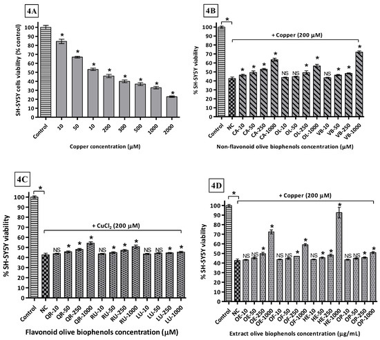 Copper-induced SH-SY5Y cells toxicity and protection by olive biophenols: SH-SY5Y cells were treated with different concentrations of copper for 24 h (4A). SH-SY5Y cells were incubated with different concentrations of non-flavonoid olive biophenols (4B), flavonoid olive biophenols (4C) and extract olive biophenols (4D) for 24 h followed by 200 μM of copper for 24 h. The results are mean ± S.E. of each parallel measurements analyzed by one way ANOVA (Tukey’s test), * p < 0.05 vs. control and negative control. NS: non-significant. PC: positive control (cells with media), NC: negative control (cells and H2O2 without biophenols), CA: caffeic acid, OL: oleuropein, HT: hydoxytyrosol, VB: verbascoside, QU: quercetin, RU: rutin, LU: luteolin, OLE: olive leaf extract, OFE: olive fruit extract, HTE: Hydroxytyrosol extremeTM, OLP: Olivenol plusTM.