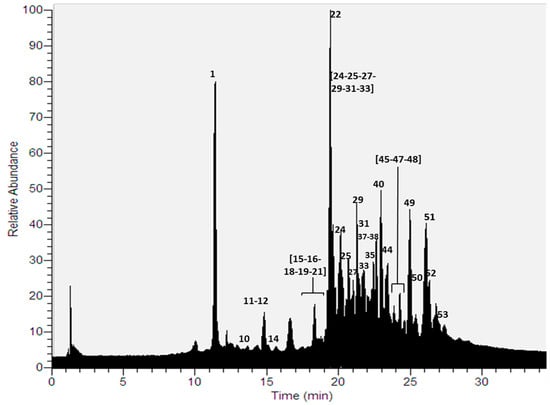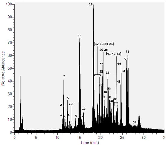 Dibenzofurans: Strepsilin, with an [M − H]− ion at m/z 269.0455, was evidenced as peak 12 [30]. The main daughter ions of peak 12 were at m/z 149.0238 and 123.0450 a.m.u. Peak 50 was identified as usnic acid [25] (molecular ion at m/z 343.0824). The main daughter ions of this peak were [M − H − CH3]−, [M − H − C4H3O2]− and [M − H − C5H3O3]− (328.0591, 259.0609 and 231.0661 a.m.u., respectively).