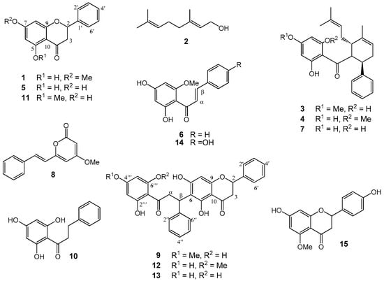 Chemical structures of Compounds 1–15 isolated from Boesenbergia rotunda.