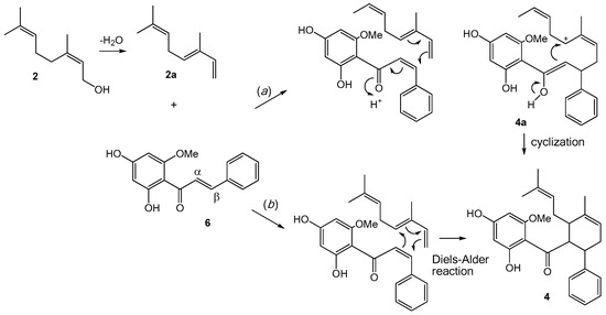 The cyclohexenyl chalcones 3, 4, and 7 can be viewed as produced from the prenylation, or more specifically, the geranylation of a chalcone (Figure 2). For example, the biogenesis of 4 can begin with the Michael addition of the chalcone cardamonin (6) with 2a, a putative dehydration product of geraniol (2). This then leads to the formation of structure 4a (path a), which can subsequently cyclize to give isopanduratin A (4), a cyclohexenyl chalcone. Alternatively, 4 may be formed directly from the [4 + 2] addition between 2a and 6 via Diels-Alder reaction (path b). Either way, the α,β-unsaturated carbonyl of the chalcone skeleton is the key starting structure.