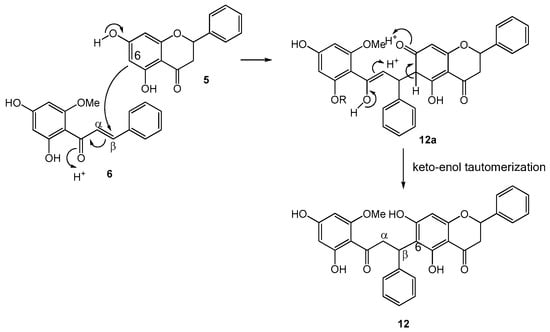 An analogous biogenetic pathway can be proposed for the biflavonoids 9, 12, and 13 (Figure 3). For instance, the biogenesis of 12 can be initiated by the nucleophilic attack from C-6 of the flavanone pinocembrin (5) onto C-β of the chalcone cardamonin (6) to form structure 12a. Through keto-enol tautomerization, 12a isomerizes to generate iso-rotundaflavanochalcone (12). To the best of our knowledge, 9, 12, and 13 are the first representatives of biflavonoids with C-6 (flavanone) to C-β (chalcone) linkage. So far, there has been only one other example of flavanone-chalcone-derived biflavonoid, which, however, involves a different type of coupling [11].