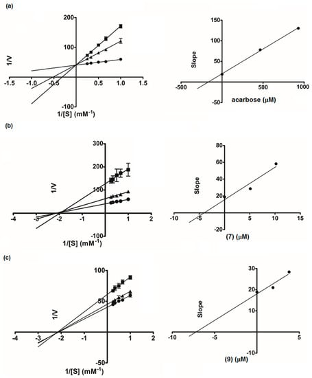 Lineweaver-Burk plots of acarbose (a): ● control, ■ acarbose 600 µg/mL, ▲ acarbose 300 µg/mL; hydroxypandurantin A (7) (b): ● control, ■ (7) 4 µg/mL, ▲ (7) 2 µg/mL; Compound 9 (c): ● control, ■ (9) 2 µg/mL, ▲ (9) 1 µg/mL. The secondary plot of each compound is on the right.