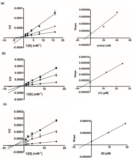 Lineweaver-Burk plots of orlistat (a): ● control, ■ orlistat 20 ng/mL, ▲ orlistat 10 ng/mL; isopanduratin A (4) (b): ● control, ■ (4) 10 µg/mL, ▲ (4) 5 µg/mL; Compound 9 (c): ● control, ■ (9) 20 µg/mL, ▲ (9) 10 µg/mL. The secondary plot of each compound is on the right.