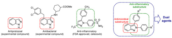 The indazole nucleus is a very important heterocyclic framework in medicinal chemistry. This scaffold is present in a large number of compounds with a wide range of biological activities [11]. Some indazole derivatives have recently been reported as antiprotozoals, with activity against E. histolytica and T. vaginalis [12,13]. Furthermore, indazole derivatives have been synthesized and tested against several Gram-positive and Gram-negative bacterial strains [11,14,15]. Particularly, 3-phenyl-1H-indazole, and some derivatives, have been identified as DNA gyrase B inhibitors [16]. Although, these reports give an insight of the potential of indazole derivatives as antiprotozoal and antibacterial agents, the information available is still limited. Therefore, it is necessary to synthesize new indazole derivatives to obtain more information about their antimicrobial potential. Considering a multitarget design approach [17], the derivatives presented in this work were designed from a combination of cyclic systems found in antiprotozoal [12,13], antibacterial [11,14,15,16,18], and anti-inflammatory compounds (Figure 1) [19,20,21]. This strategy was chosen because an inflammatory response is commonly found in infectious and parasitic diseases (e.g., amebiosis and trichomonosis). Moreover, previous studies showed that amebic infections induce host cyclooxygenase-2 (COX-2) and consequently the production of prostaglandin PGE2. Therefore, it has been suggested that PGE2 could play a major role in pathogenesis of E. histolytica [22,23]. Eighteen compounds including 2-phenyl-2H-indazole and 2,3-diphenyl-2H-indazole derivatives were synthesized and tested against the protozoa G. intestinalis, E. histolytica, and T. vaginalis. The more active antiprotozoal compounds were tested against some bacterial and yeast strains including enterohemorrhagic and enteroaggregative E. coli (strain 933/EHEC and strain 042/EAEC), S. enterica serovar Typhi, C. albicans, and C. glabrata. Additionally, six selected compounds were assayed in vitro and in silico as potential anti-inflammatory agents using the COX-2 inhibition assay. To shed light on the potential toxic effects, the cytotoxicity of a selected group of compounds was assessed on HaCaT (aneuploid immortal keratinocytes) and HeLa (human epitheloid cervix carcinoma) cells.