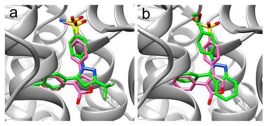 Predicted binding modes on human COX-2 for celecoxib (panel (a)) and 18 (panel (b)). Docked compounds are shown in green, whereas the crystallographic reference rofecoxib is in pink.