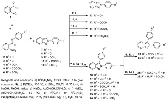 The 2-phenyl-2H-indazole and 2,3-diphenyl-2H-indazole derivatives (7–26) were synthesized as illustrated in Scheme 1. The commercially-available 2-nitrobenzaldehyde (1) was heated with aniline or p-substituted aniline under reflux conditions to afford the corresponding Schiff bases (2–4, 6); only the reaction to afford compound 5 was conducted at room temperature to achieve better results. Compounds 2–6 were reduced and cyclocondensed with P(OEt)3 to give the 2-phenyl-2H-indazole derivatives (7–11) by the Cadogan reaction [24]. Compound 12 was synthesized by o-demethylation of 9 with boron tribromide [25]. Hydrolysis of 10 with NaOH afforded the carboxylic acid 13. Compounds 14 and 15 were obtained by S-oxidation of 11 with sodium metaperiodate [26]. Compounds 16–19 and 22–24 were synthesized by a palladium-catalyzed arylation of the corresponding 2-phenyl-2H-indazole derivative with a variety of aryl iodides or bromides as previously reported [27]. Chemical yields for the palladium catalyzed arylation were slightly lower as compared to previously reported data by Ohnmacht et al. These results can be explained since the original reported methodology was scaled up tenfold to achieve the needed quantity of products for the biological assays. With the same procedure of hydrolysis and S-oxidation described above, compounds 20 and 25 were obtained from 18 and 23, respectively, whereas 19 and 24 were used as starting material to produce 21 and 26.
