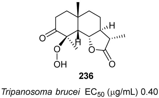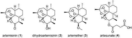 Antimalarial properties of peroxides are currently intensively studied. Artemisinin (Qinghaosu) (1), a natural peroxide possessing high antimalarial activity, was isolated in 1971 from leaves of annual wormwood (Artemisia annua) in the context of the scientific program “Project 523”, initiated by Chinese government in 1967 [18,19,20]. The Nobel Prize in Physiology or Medicine 2015 was awarded to Chinese pharmaceutical chemist Tu Youyou “for her discoveries concerning a novel therapy against Malaria” [21,22,23]. Considering the development of antibiotic resistance of Plasmodium to some traditional drugs, such as quinine, chloroquine, and mefloquine, and other anti-parasitic ones, pharmaceuticals based on artemisinin and its semi-synthetic derivatives—dihydroartemisinin (2), artemether (3) and artesunate (4) (Figure 1)—are currently the most effective drugs against malaria [24,25,26,27,28,29,30].