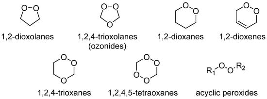 Since peroxides with a related structure have different types of activity, the systematization of this review is based on the structure of the peroxide fragment (Figure 2). The first sections consider the preparation of cyclic peroxides in order of increasing cycle and the number of oxygen atoms in it, while the last section deals with peroxides of acyclic structure. The following abbreviations are used in describing the biological activity of peroxides: minimum inhibitory concentration (MIC), minimum lethal concentration (MLC), half maximal inhibitory concentration (IC50), concentration of inhibiting 90% of activity (IC90), half maximal effective concentration (ЕС50), and median effective dose (ED50) [53,54].